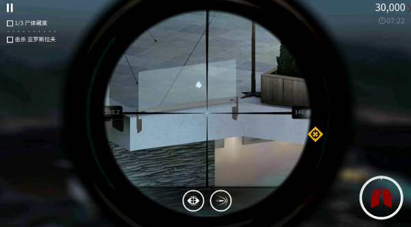 精准射击要巧妙利用环境。狙击的关键就在于打得准,用狙击镜放大画面,仔细判断目标离自己有多远,还有风向如何,然后调整好射击角度。比如目标离得远,子弹会下坠,得提前把准星往上抬一点;要是逆风,子弹会被吹偏,就要把射击角度再调高一些来补偿。游戏里还有很多环境道具可以利用,像风扇开关,打一下能吸引警卫过来,再打碎玻璃或者变压器,就能让警卫掉下去受伤。还有汽油桶、车辆这些,打爆了能同时消灭好几个目标。