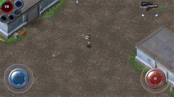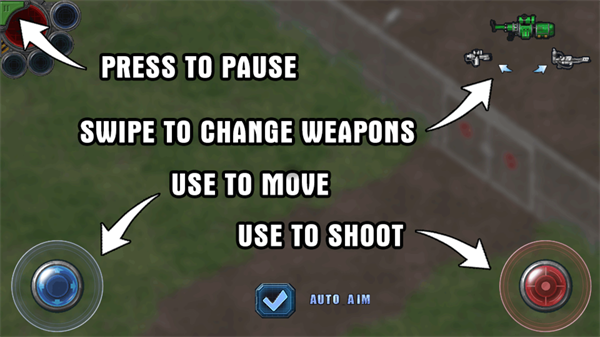 3、进入游戏界面后,先看看按键介绍,左下角是控制角色移动的按键,右下角是射击键。
