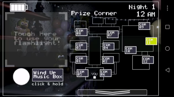 3、最后说说二代里永远滴神,也就是之前没细说的小丑和狐狸。狐狸和其他老玩偶出身一样,但从cam08出击后,会直接来到走廊尽头站桩,面具对它没用,因为它能看出你不是玩偶,不过手电的光能阻止它跳杀,还能慢慢把它驱走。只是,驱走后,回到cam8一小会儿它就会回来继续之前的流程,长期不照它,那就难逃一死。小丑和它的八音盒在cam11,八音盒的发条(那个白色的圆)会缓缓回落,需要你按旁边按键重新“上发条”。要是任由发条回落到底,小丑就会出击,没有任何防御方法,稍过一会儿你就会被它“解决”,它们可是二代最大的威胁,估计也是大部分玩家被“gank”的原因。