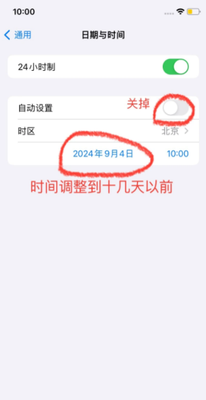 3、把游戏切到后台(不要退出游戏),打开手机时间设置,关掉自动设置,把时间调整到十几天之前。