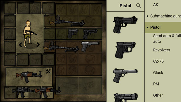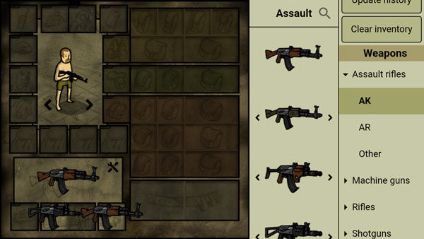 1、进入游戏首页开启游戏后,能看到右侧有一列选项框,里面有“save”“land”“clear”等不同项目,每个项目都对应着特定内容。比如“bag”对应书包和军用背包,“eye”对应夜视仪和战术护目镜。你可以用手把想选择的物品拖动到人物四周对应的方框里,要是放错了方框,所选物品就无法保留。这里要注意,暗色部分需要先放置背包等物品来解锁贮存空间。