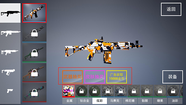 4、要是觉得武器不够多,还能通过武器抽奖、皮肤抽奖,或者看看广告来获取更多厉害的武器。
